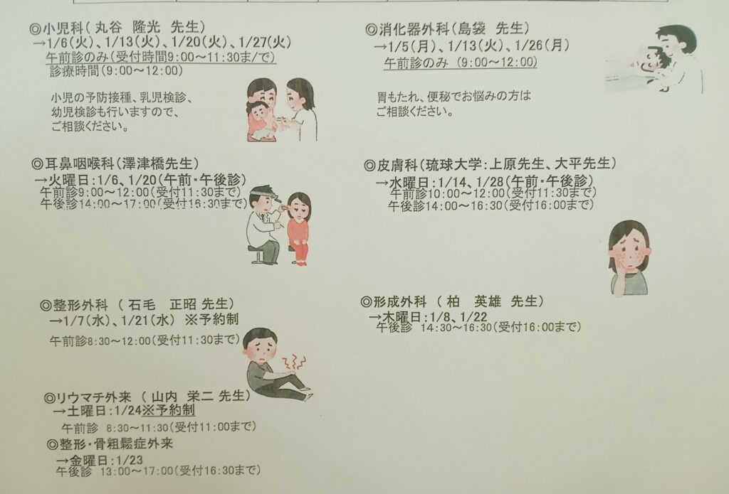 *1月7日(水)、21日(水)の整形外科並びに1月6日(火)、20日(火)の耳鼻科は診療をスムーズにするため、予約された方を優先とさせて頂きます。早めのご予約を推奨いたします。
