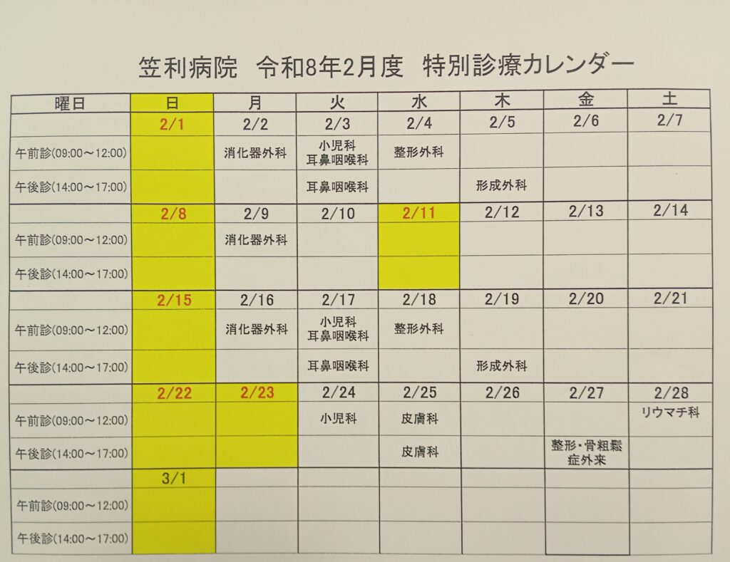 2月の特別診療カレンダー追加しました